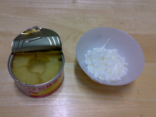 準備把鳳梨罐裡的湯汁無蛋沙拉下鍋