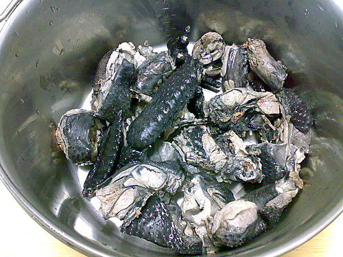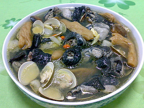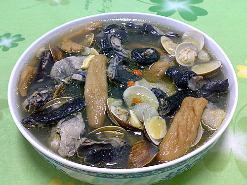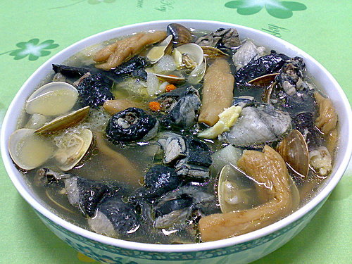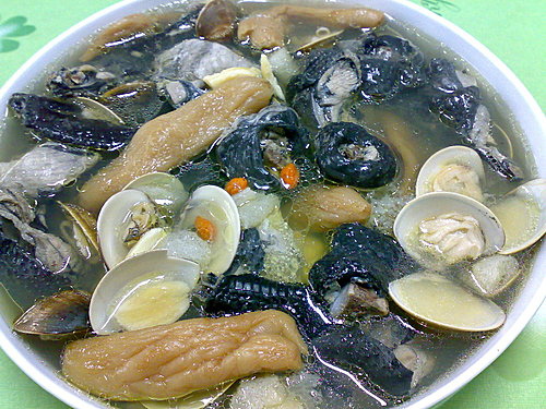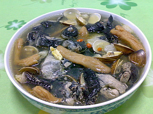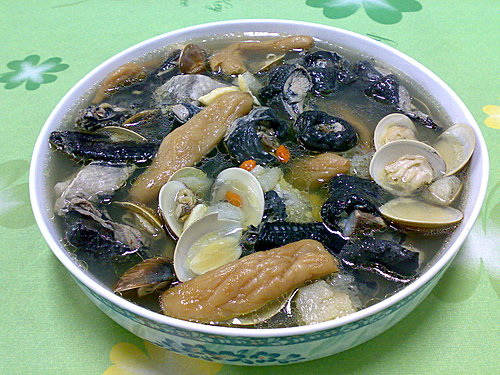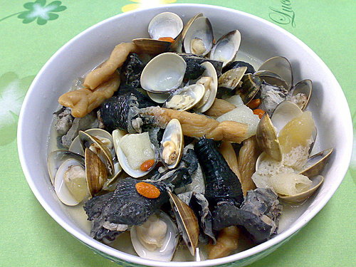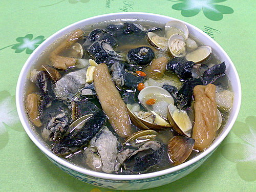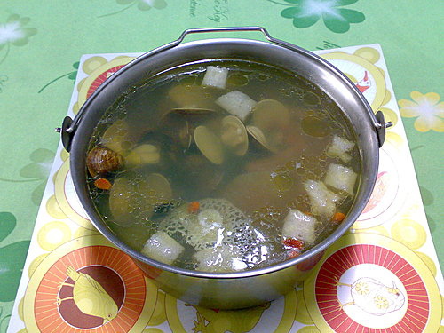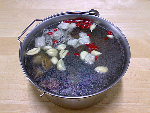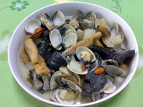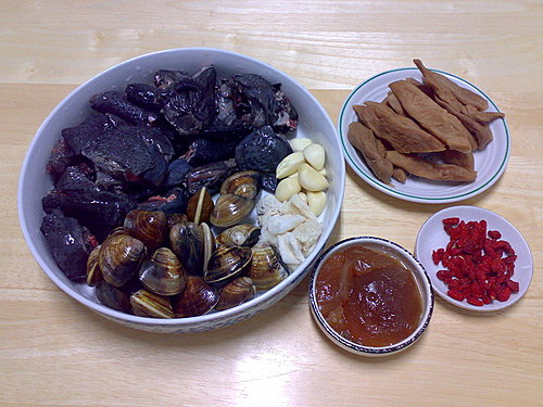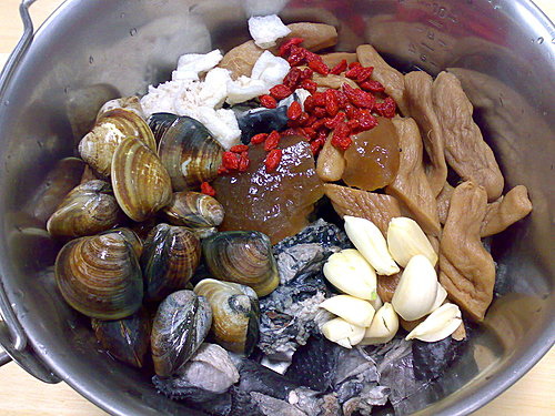 材料:烏骨雞 蛤蜊 竹笙 蒜頭 老菜脯 冬瓜醬 枸杞