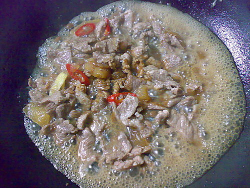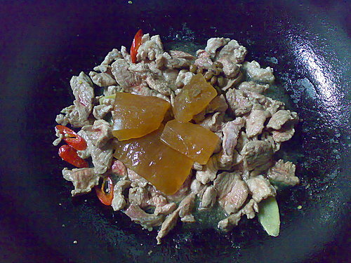 肉片跟冬瓜醬一起煮到入味在加少許醬油跟一大匙砂糖不要加鹽喔~~~