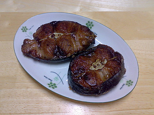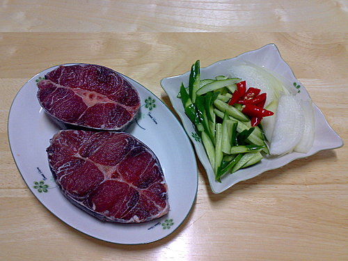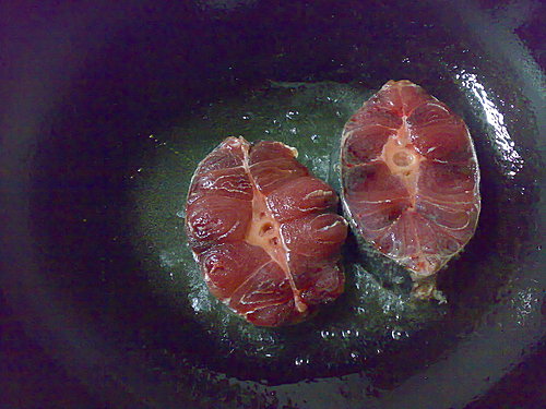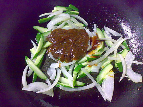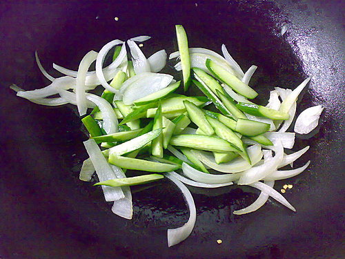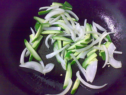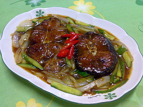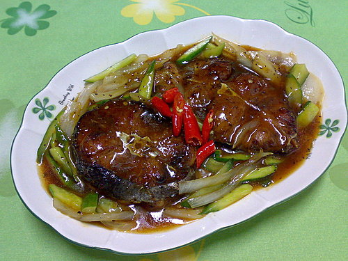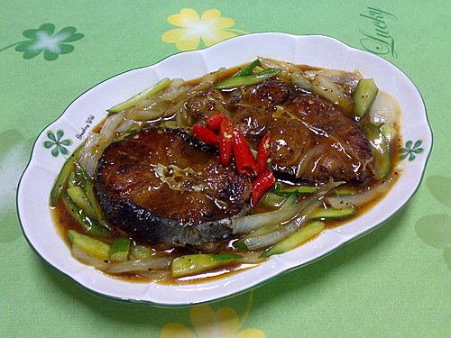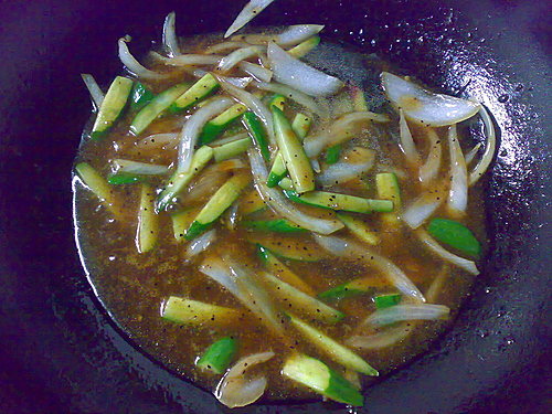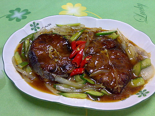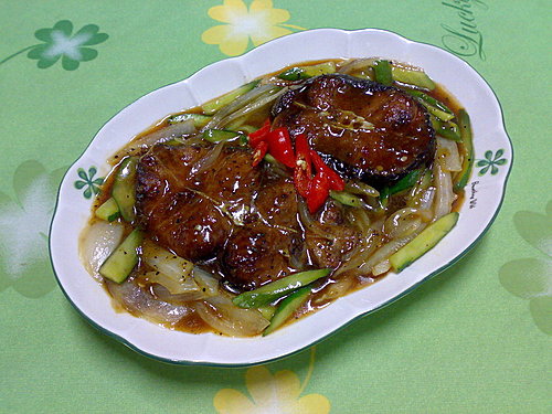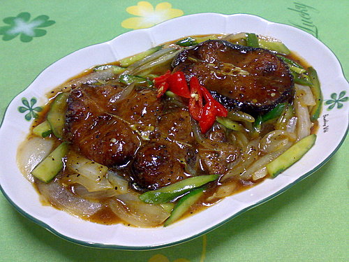材料: 魚塊 洋蔥切絲 小黃瓜斜切片 辣椒 黑胡椒醬